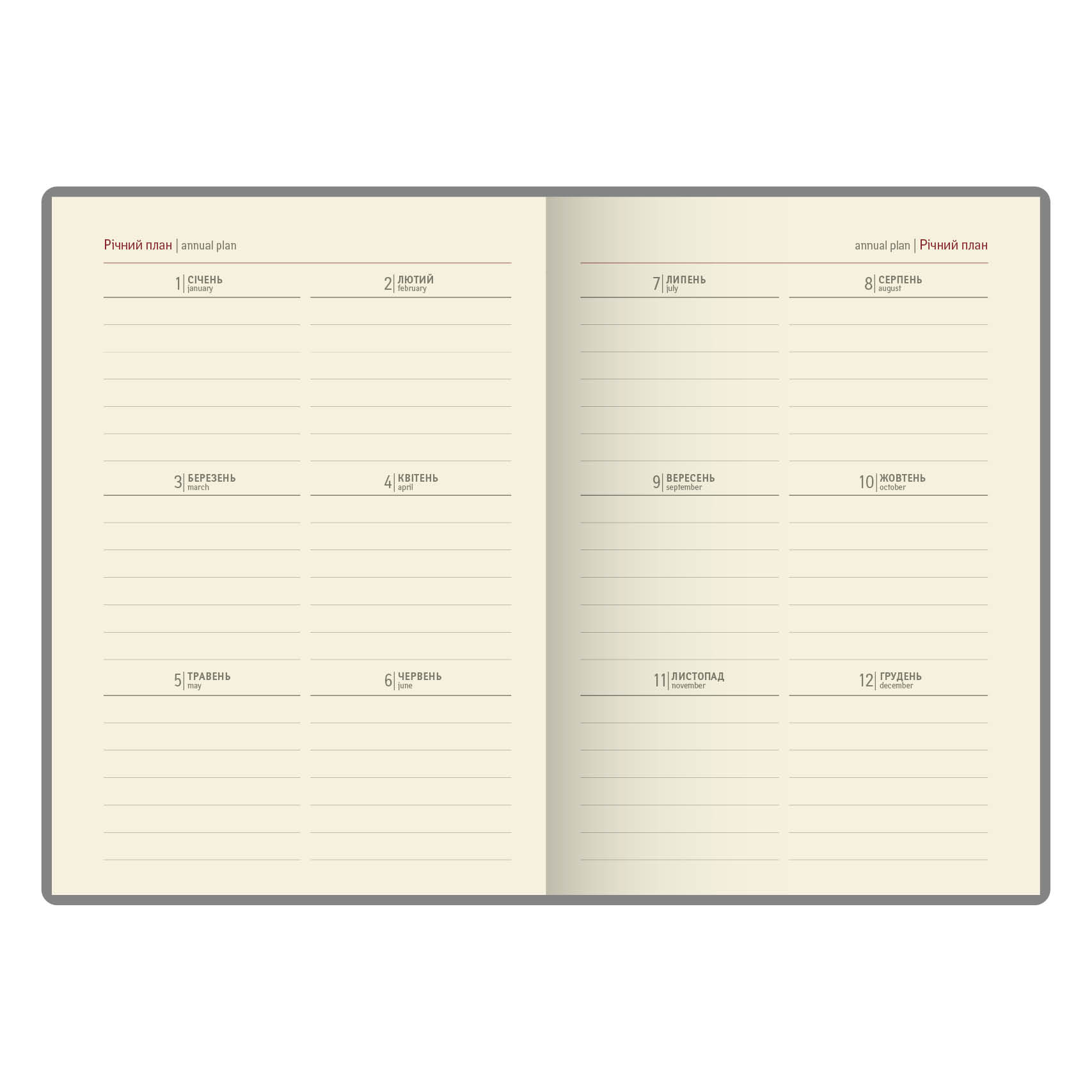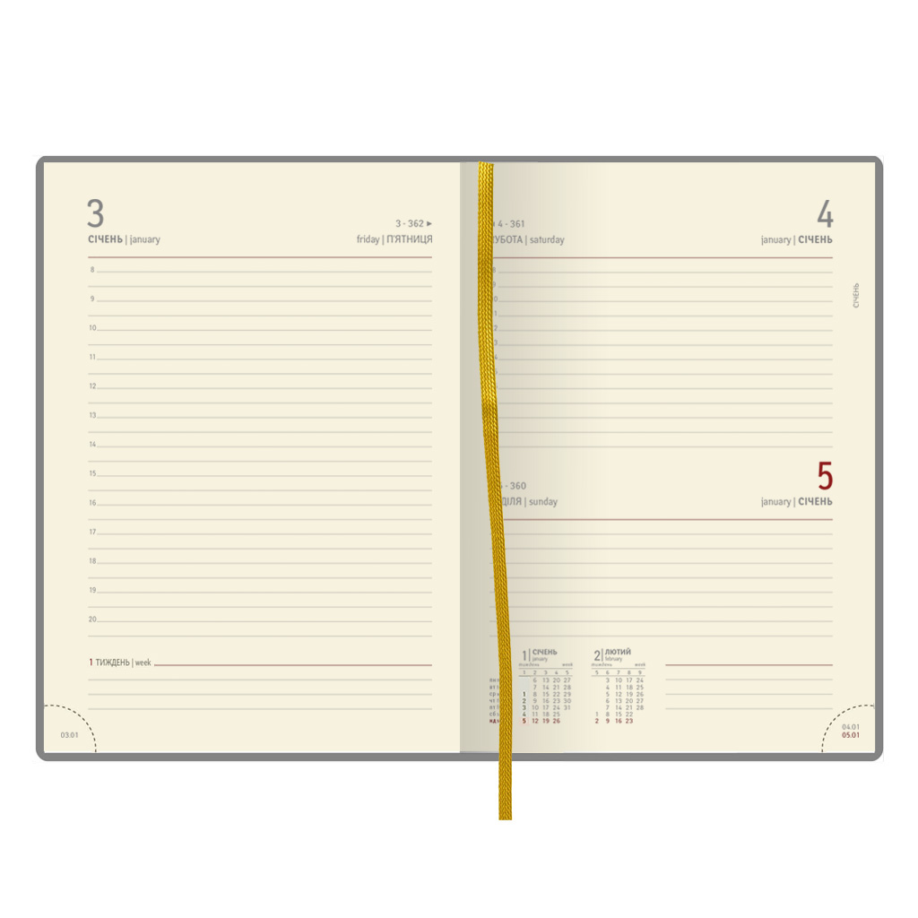 Діловий щоденник датований. Формат 145х202 мм. Кількість сторінок 352. Блок кремовий офсет 70г/м2. Колір капталу та лясе - золото. Мова укр., англ. Форзац - кольорові мапи України, Європи. Матеріал обкладинки штучна шкіра. Інформаційний блок містить:-Валюти країн світу-Позначення країн та територій в Інтернеті-Правила догляду за одягом та знаки на етикетці-Розміри одягу та взуття-Одиниці для вимірювання фізичних величин-Офіційні правила тлумачення торгівельних термінів міжнародної торгової палати Інкотермс 2020-Автомобільні коди країни-Часові пояси-Відстані між європейськими містами та між обласними центрами України-Міжнародні штрихові коди.