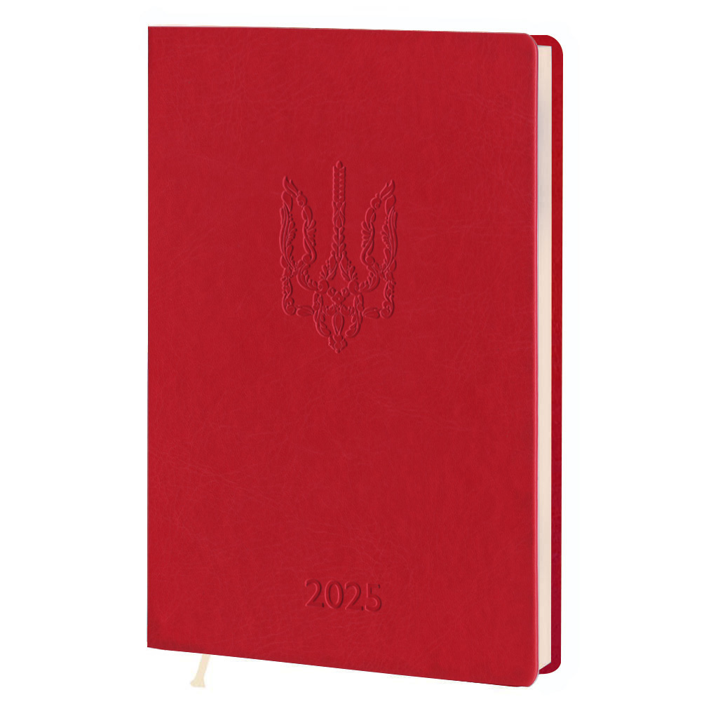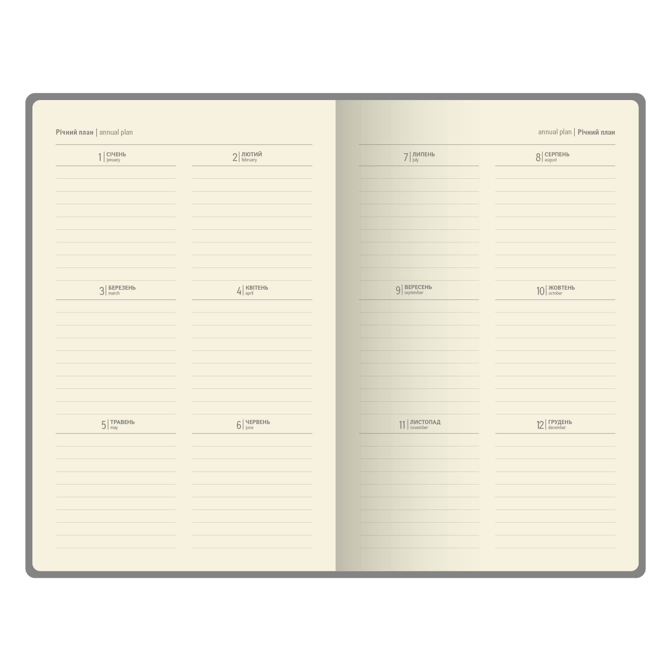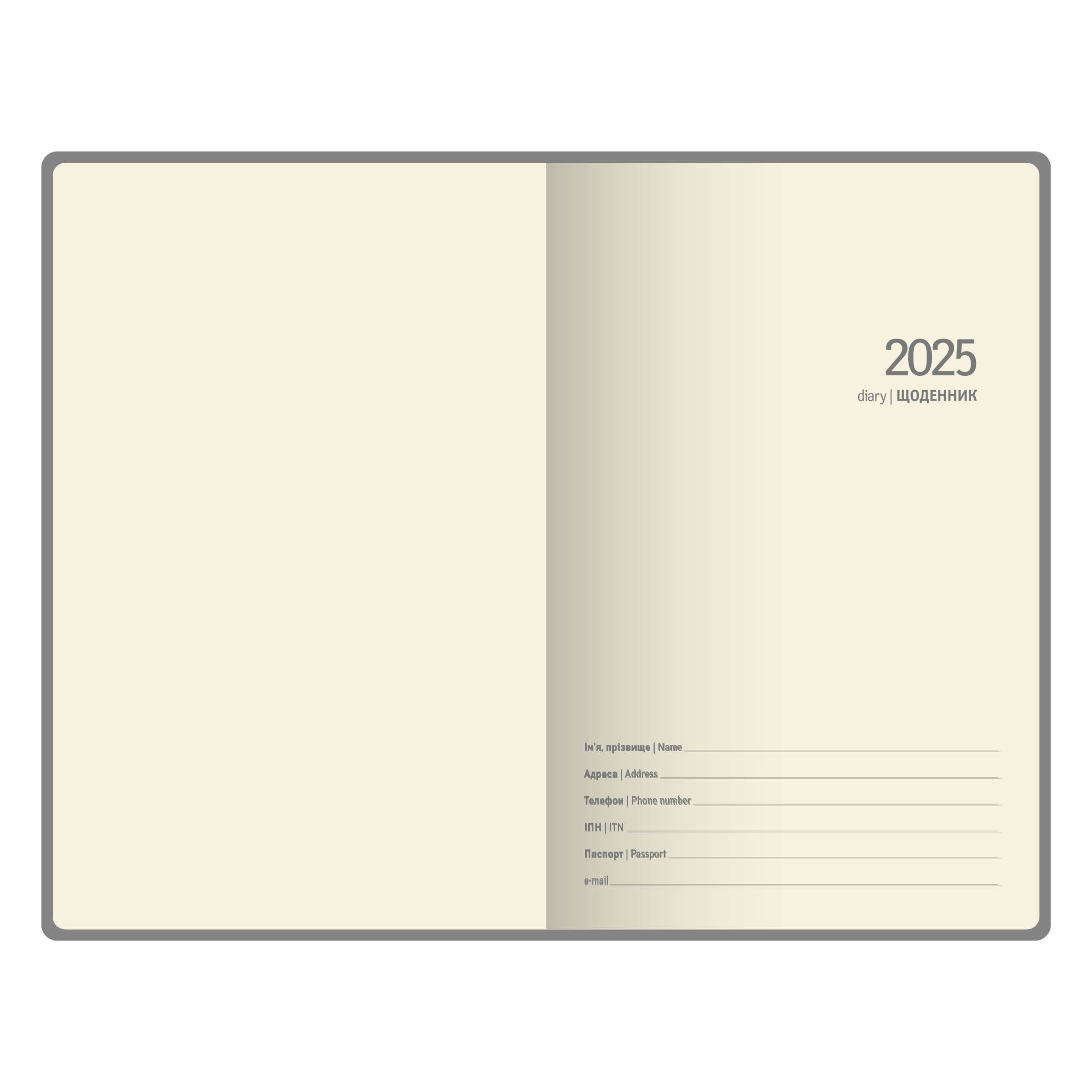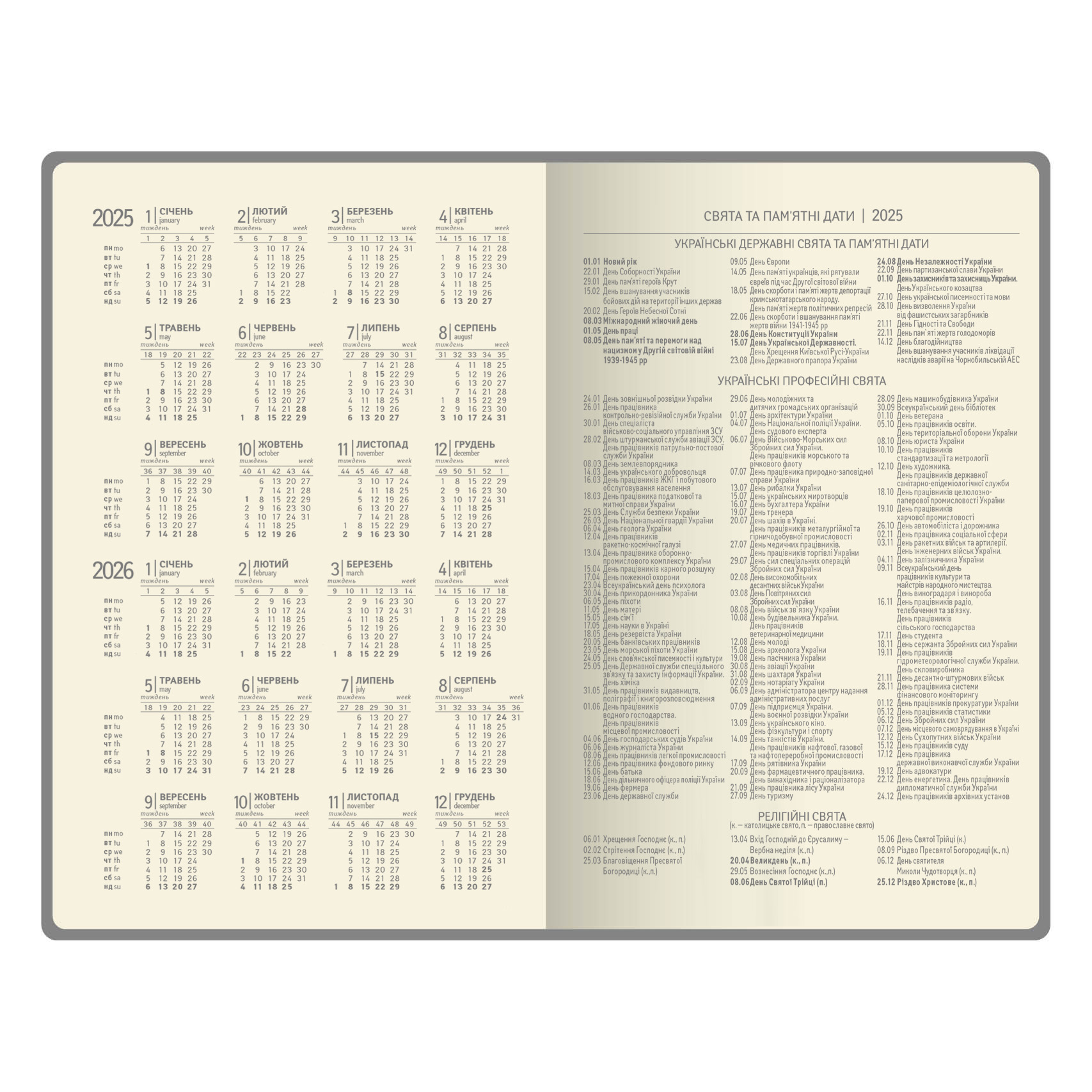 Діловий щоденник датований. Формат 130х202 мм. Кількість сторінок 320. Блок кремовий офсет 70г/м2. Колір капталу та лясе - крем. Мова укр., англ. Форзац - кремовий. Матеріал обкладинки штучна шкіра.