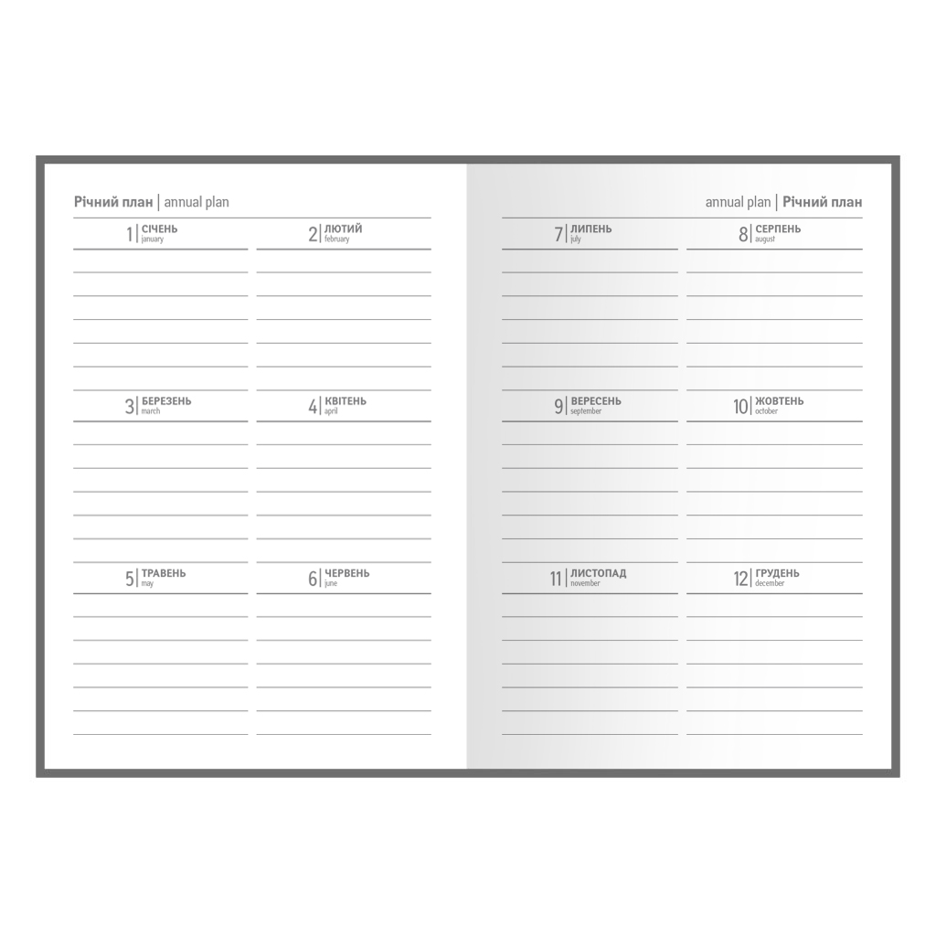 Діловий щоденник датований. Формат 98х140 мм. Кількість сторінок 320. Блок білий офсет 70г/м2. Колір капталу та лясе - білий. Мова укр., англ. Форзац - без друку білий. Матеріал обкладинки баладек.