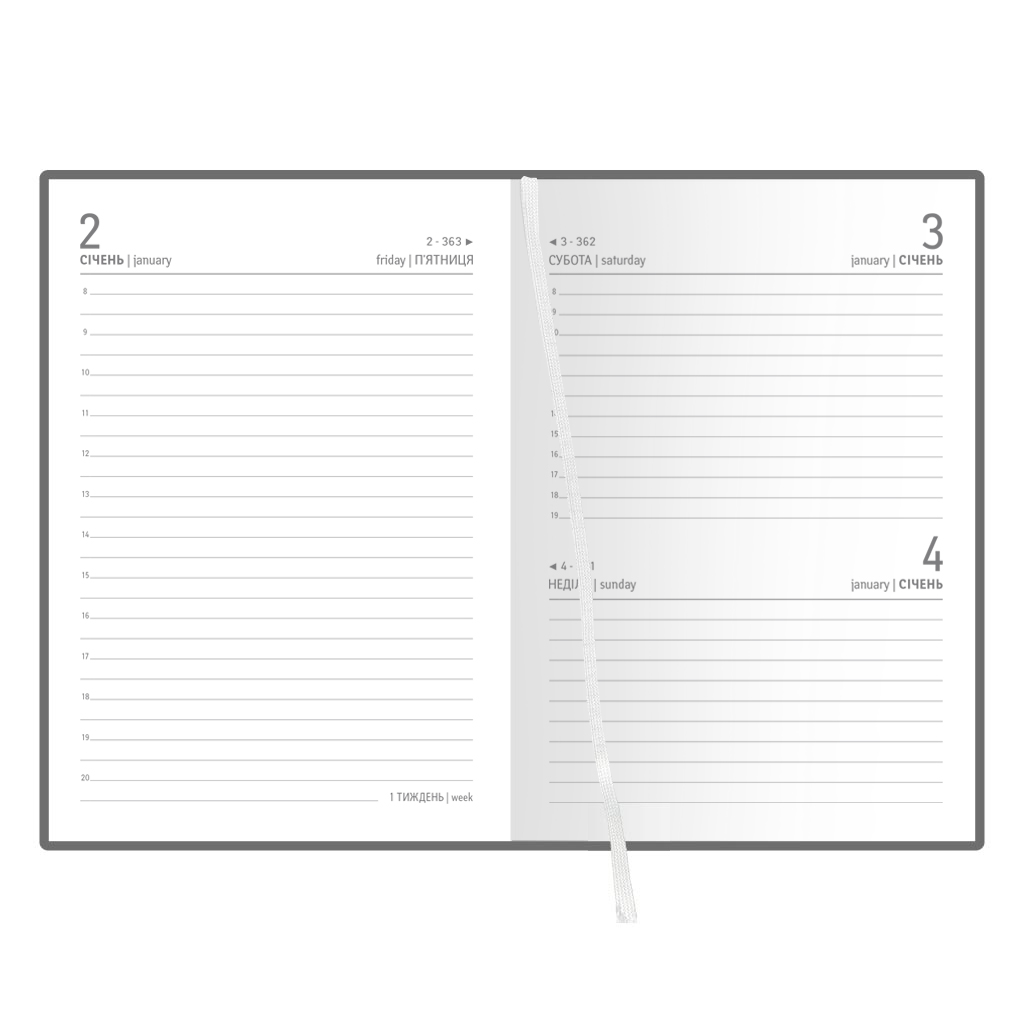 Діловий щоденник датований. Формат 98х140 мм. Кількість сторінок 352. Блок білий офсет 70г/м2. Колір капталу та лясе - білий. Мова укр., рос., англ. Форзац - без друку білий. Матеріал обкладинки штучна шкіра.Інформаційний блок містить:-Телефонні коди міст України-Міжнародні телефонні коди-Довідкові телефони-Розміри одягу та взуття-Валюти країн світу-Одиниці для вимірювання фізичних величин