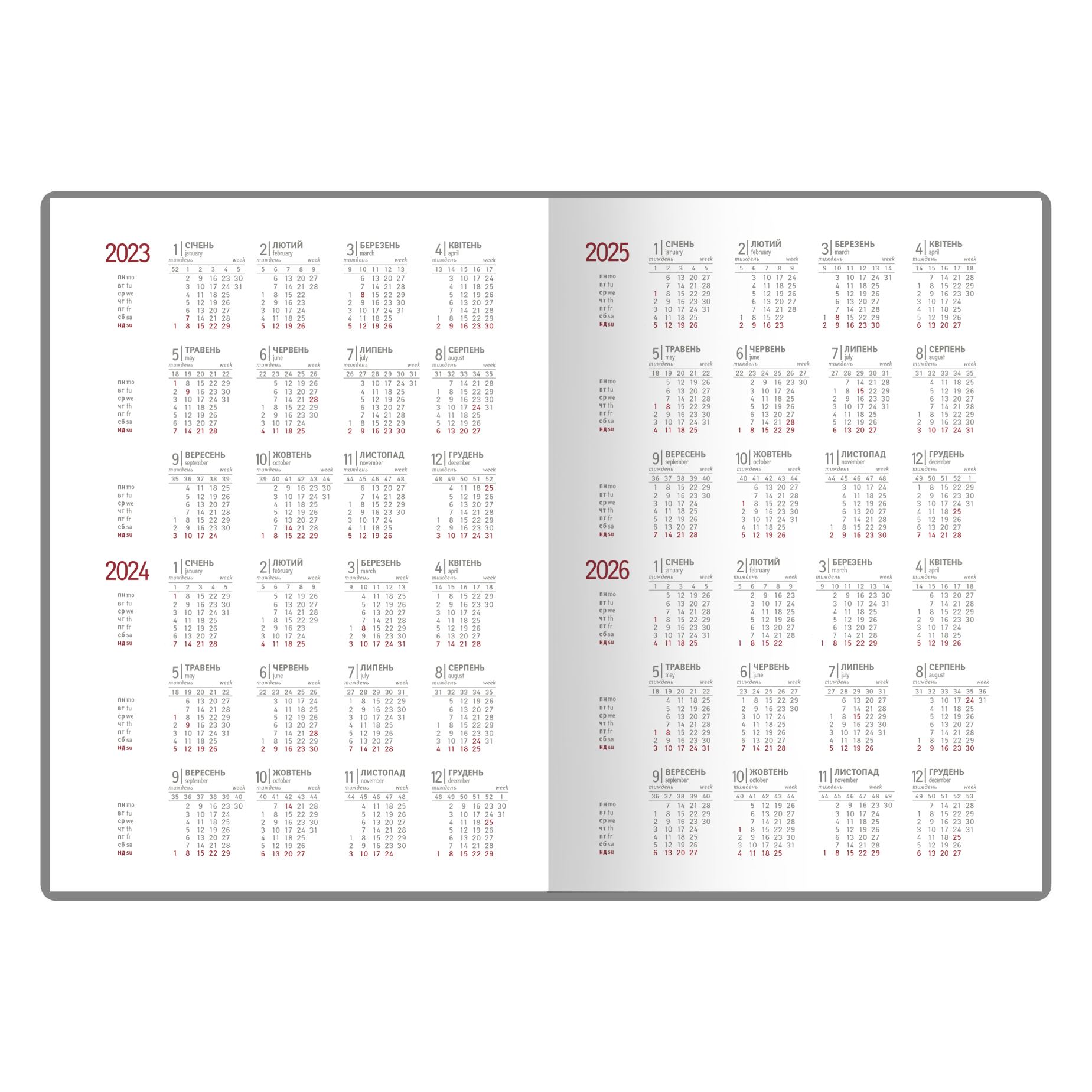 Діловий щоденник недатований. Формат 145х202 мм. Кількість сторінок 256. Блок білий офсет 70г/м2, лінія. Колір капталу та лясе - білий. Мова укр., англ. Форзац - без друку білий. Обкладинка штучна шкіра.