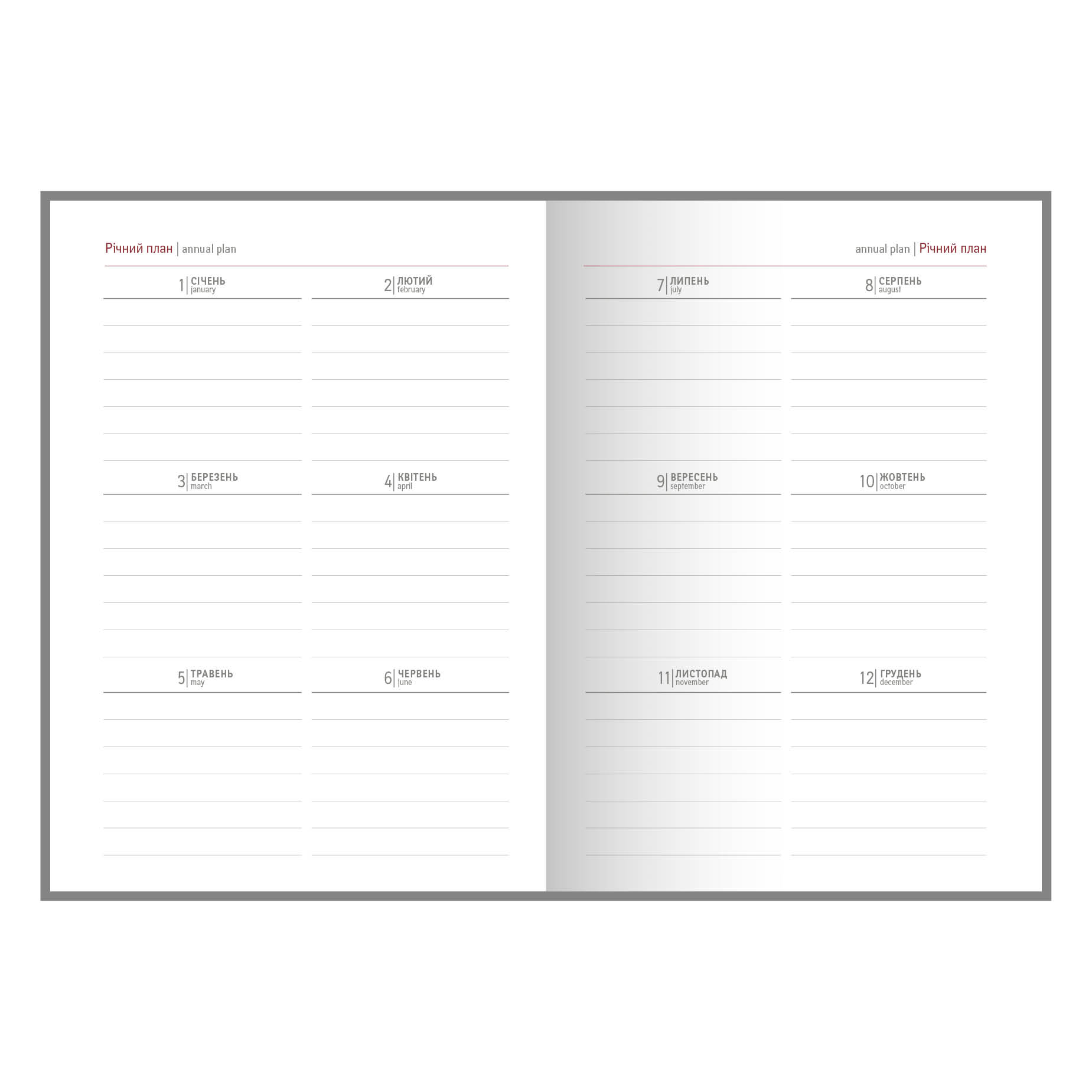 Діловий щоденник недатований. Формат 145х202 мм. Кількість сторінок 256. Блок білий офсет 70г/м2, клітинка. Колір капталу та лясе - білий. Мова укр., англ. Форзац - без друку білий. Обкладинка: покривка баладек, сторонки картон палітурний.