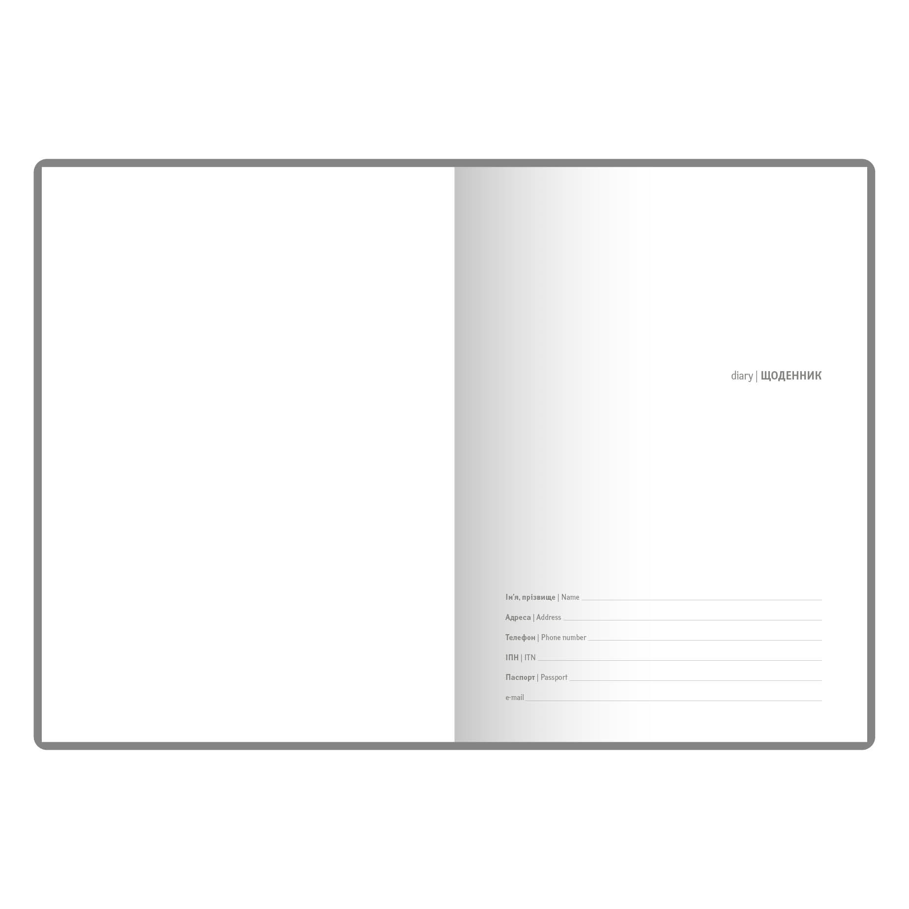 Діловий щоденник недатований. Формат 145х202 мм. Кількість сторінок 256. Блок білий офсет 70г/м2, клітинка. Колір капталу та лясе - білий. Мова укр., англ. Форзац - без друку білий. Обкладинка штучна шкіра.