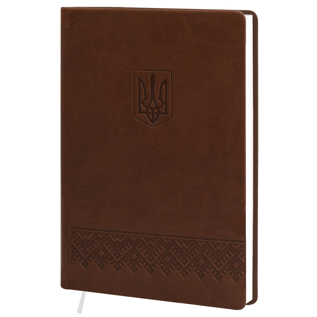 Діловий щоденник недатований. Формат 145х202 мм. Кількість сторінок 256. Блок білий офсет 70г/м2, лінія. Колір капталу та лясе - білий. Мова укр., англ. Форзац - без друку білий. Обкладинка штучна шкіра.