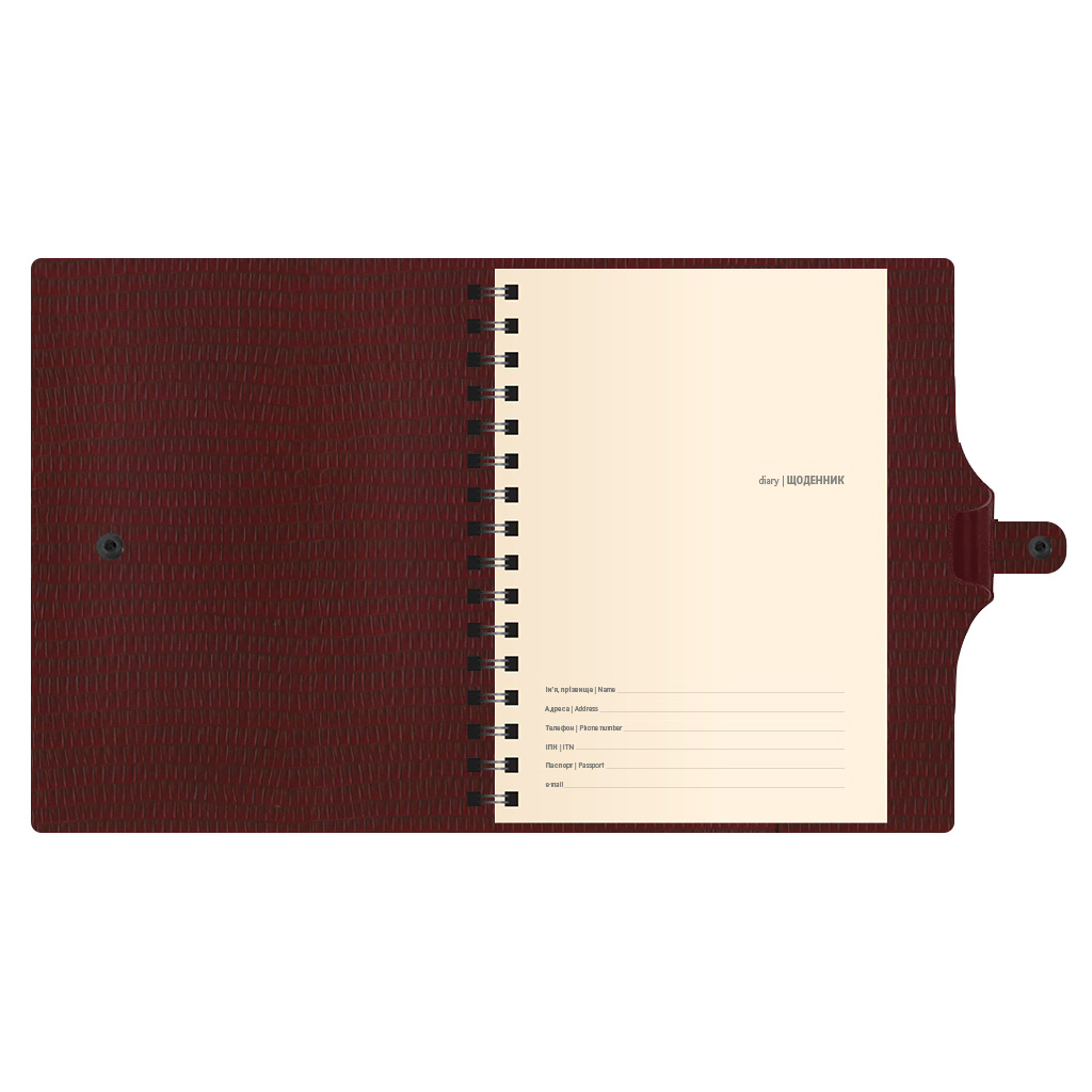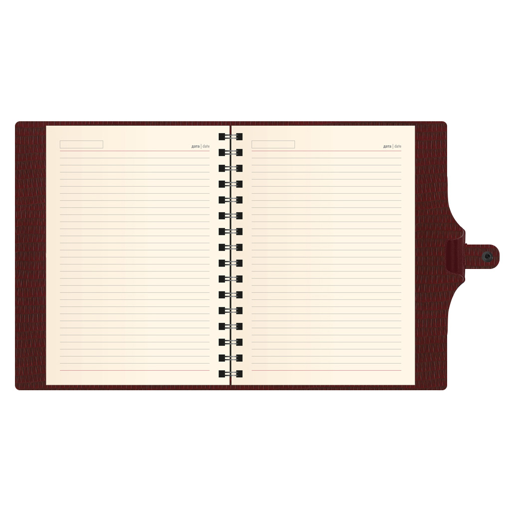 Діловий щоденник недатований. Формат 145х205 мм. Кількість сторінок 292. Блок кремовий офсет 70г/м2, лінія, на спіралі. Обкладинка гнучка штучна шкіра з кнопкою.
