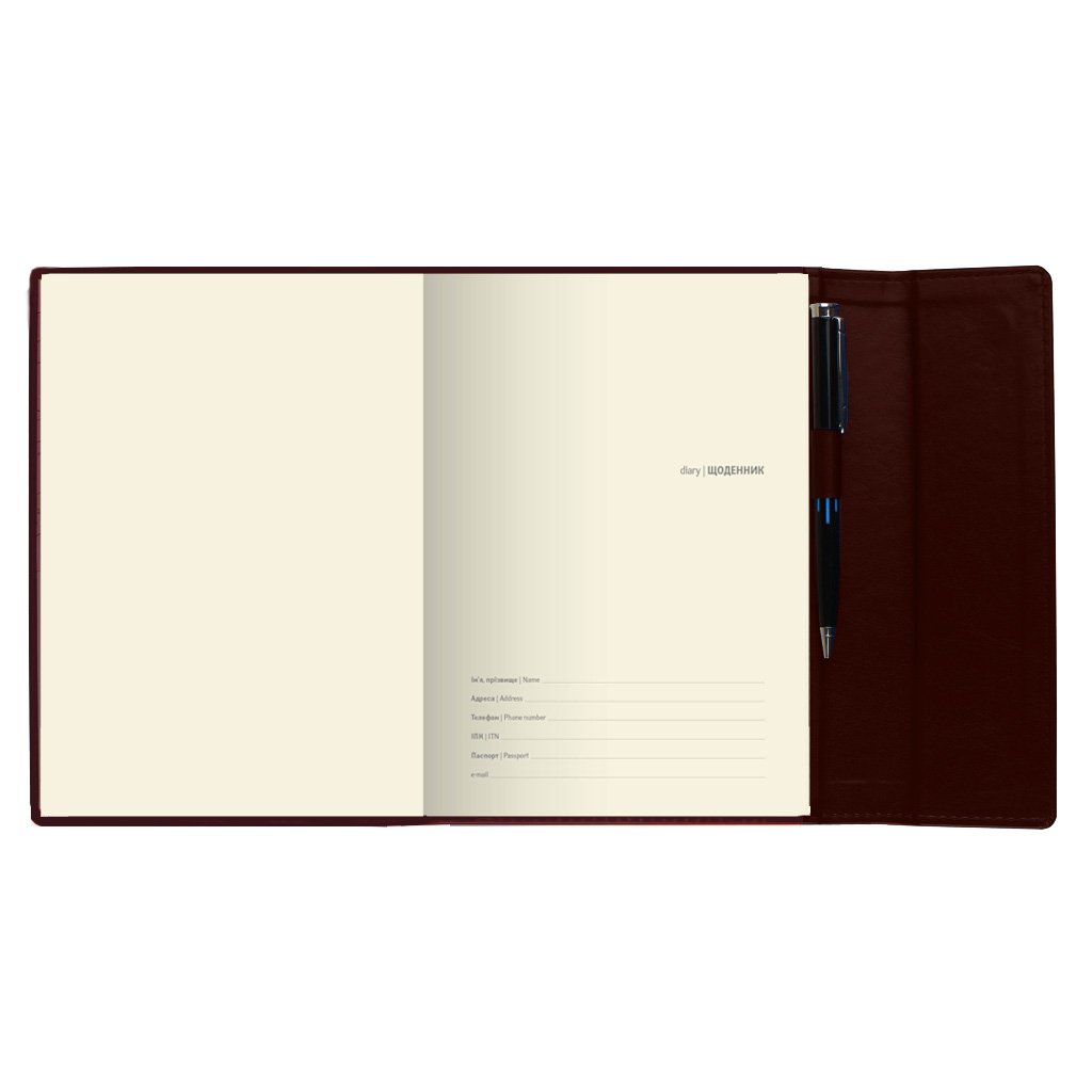 Діловий щоденник недатований. Формат 145х202 мм. Кількість сторінок 352. Обкладинка штучна шкіра з клапаном на магниті зі строчкою по-периметру. Оснащений петлею для ручки. Блок кремовий офсет 70г/м2, лінія. Колір капталу та лясе - золотий. Мова укр., рос., англ. Перфоровані відривні кутики. Форзац - кольорові мапи Європи і України.Інформаційний блок містить:-Валюти країн світу-Позначення країн та територій в Інтернеті-Правила догляду за одягом та знаки на етикетці-Розміри одягу та взуття-Одиниці для вимірювання фізичних величин-Офіційні правила тлумачення торгівельних термінів міжнародної торгової палати Інкотермс 2020-Автомобільні коди країни-Часові пояси-Відстані між європейськими містами та між обласними центрами України-Міжнародні штрихові коди.