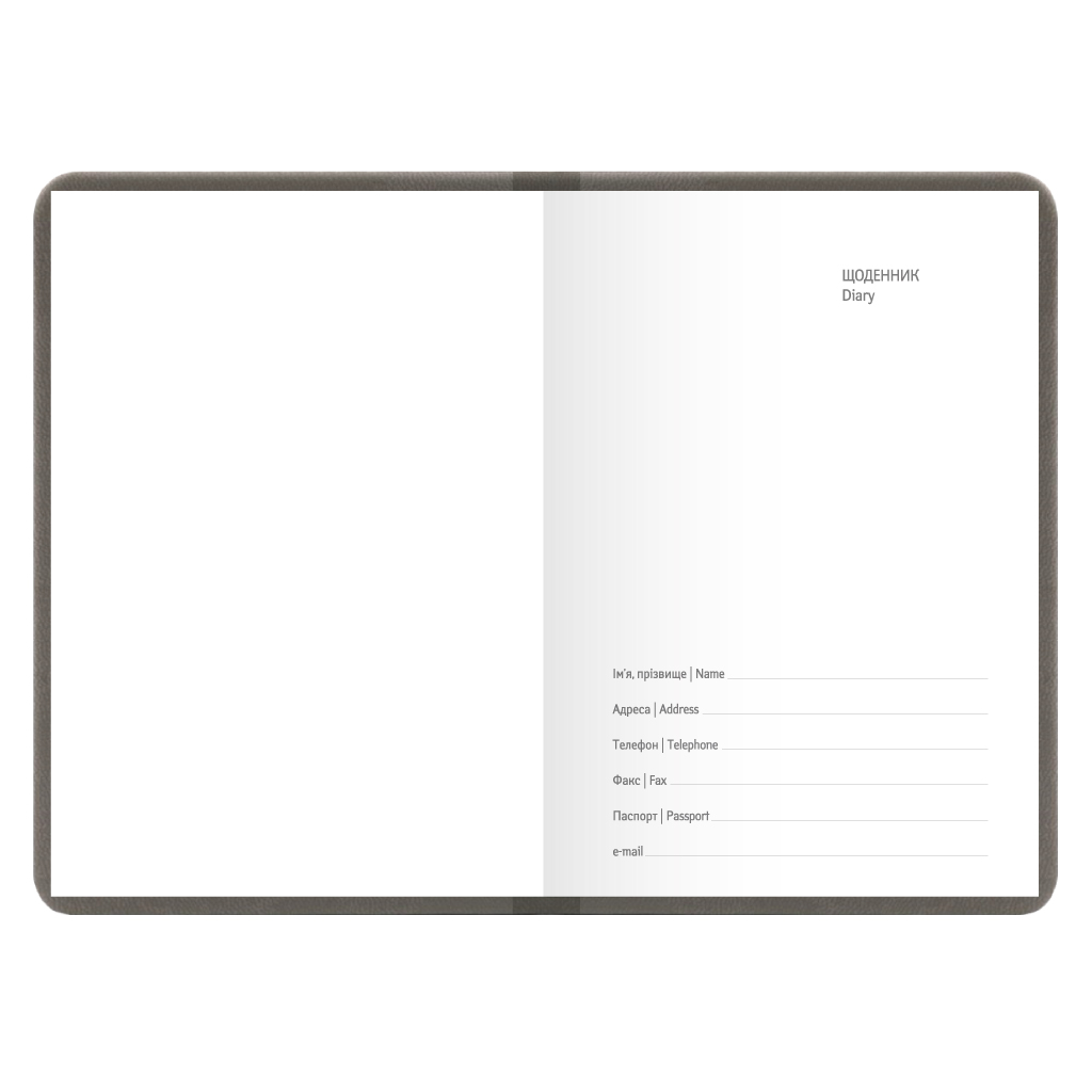 Діловий щоденник недатований. Формат 98х140 мм. Кількість сторінок 288. Обкладинка штучна шкіра, . Блок білий офсет 70г/м2, клітинка. Колір капталу та лясе - білий. Мова укр., англ. Форзац - білий офсет. Обкладинка гнучка штучна шкіра з кнопкою.