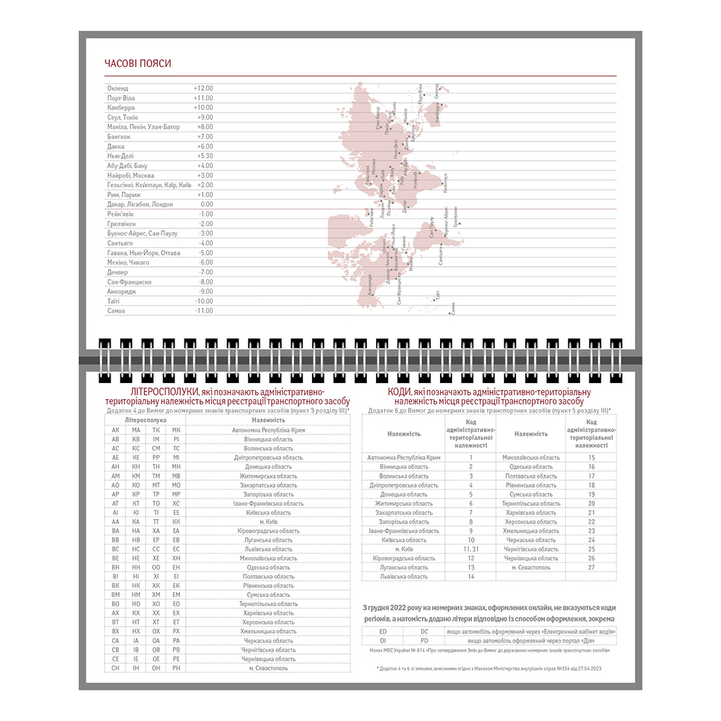 Тижневик недатований на спіралі. Формат 90х150 мм. Кількість сторінок 126. Блок білий офсет 70г/м2. Мова укр., англ.. Матеріал обкладинки баладек. Інформаційний блок містить:-Телефонні коди обласних центрів України-Телефонні коди країн Балтії та СНД-Довідкові телефони-Міжнародні телефонні коди-Часові пояси-Відстані між європейськими містами та між обласними центрами України