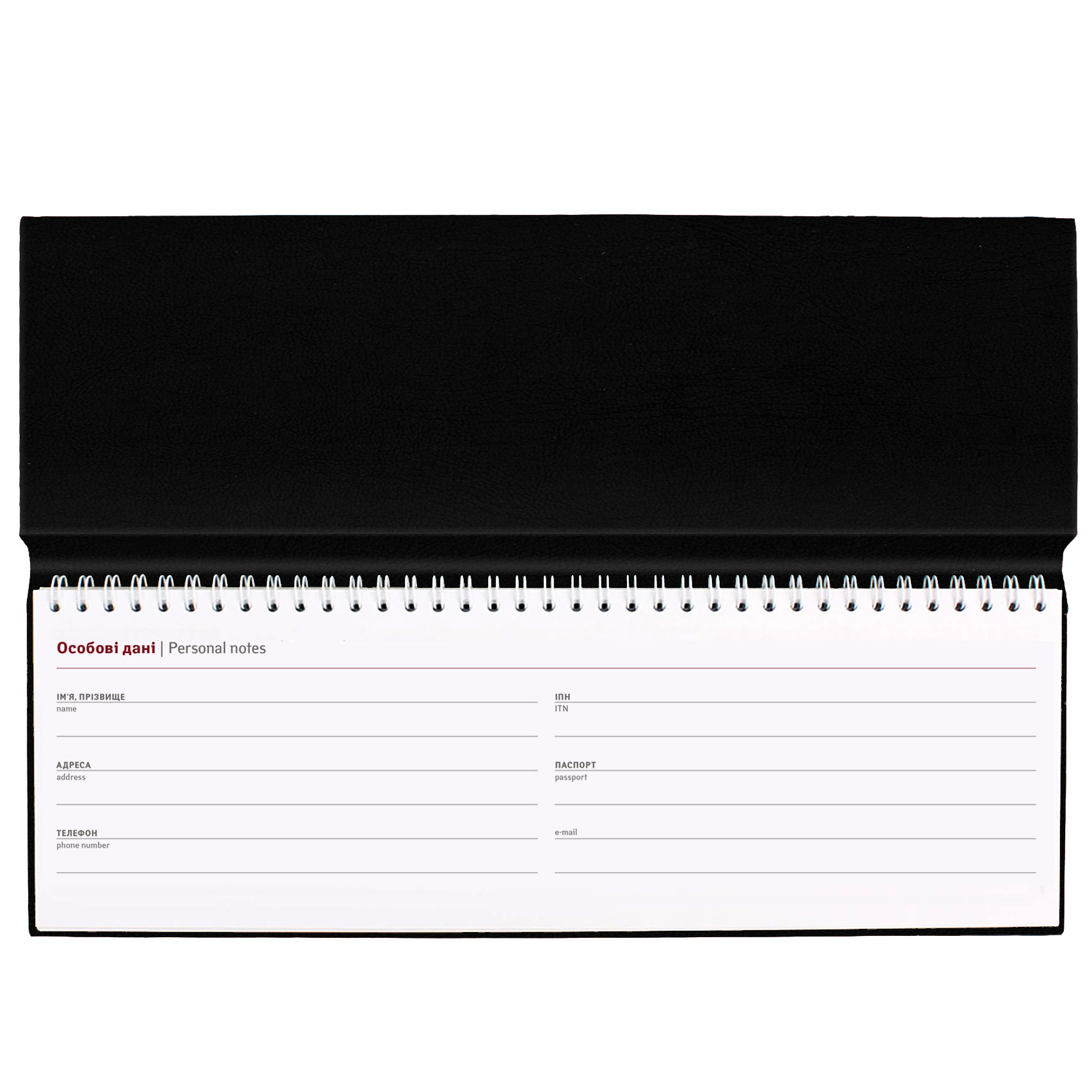 Тижневик недатований. Формат 297х104 мм. Кількість сторінок 116. Блок білий офсет 70г/м2. Мова укр., англ. Обкладинка: покривка баладек, сторонки верхня картон палітурний з поролоном, нижня картон палітурний.