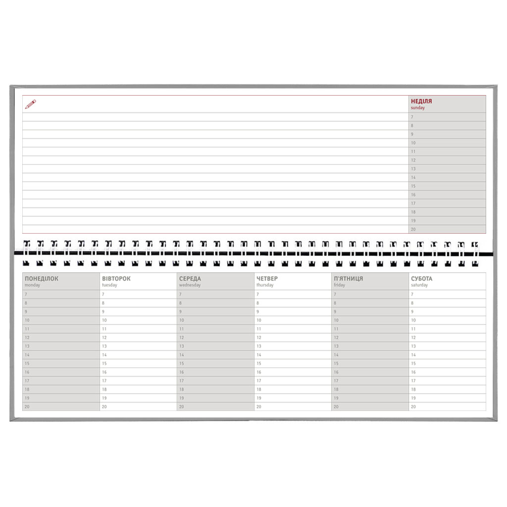 Тижневик недатований. Формат 297х104 мм. Кількість сторінок 116. Блок білий офсет 70г/м2. Мова укр., англ. Обкладинка: покривка баладек, сторонки верхня картон палітурний з поролоном, нижня картон палітурний.