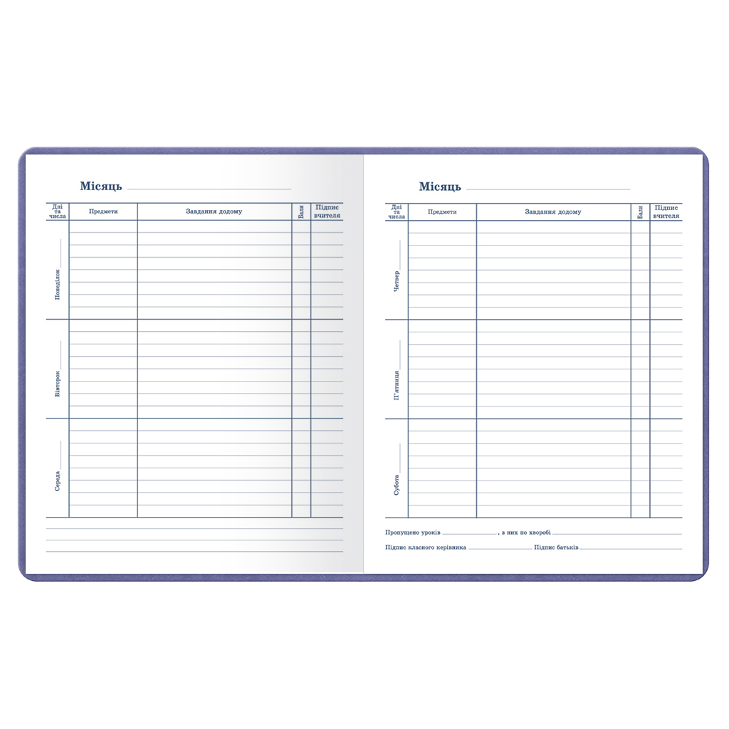 Щоденник шкільний А5 (160х198), 42 акуші. Обкладинка: покривка штучна шкіра, сторонки картон картон хром-ерзац. Блок офсетний папір 80г/м2. Структура внутрішнього блоку: -загальні відомості про учня, -відомості про вчителів, -розклад уроків по семестрах на рік. -основній блок - розклад на тиждень на розвороті (8 уроків, 6 днів тижня), -табель успішності учня.