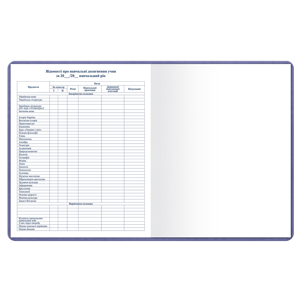 Щоденник шкільний А5 (160х198), 42 акуші. Обкладинка: покривка штучна шкіра, сторонки картон картон хром-ерзац. Блок офсетний папір 80г/м2. Структура внутрішнього блоку: -загальні відомості про учня, -відомості про вчителів, -розклад уроків по семестрах на рік. -основній блок - розклад на тиждень на розвороті (8 уроків, 6 днів тижня), -табель успішності учня.
