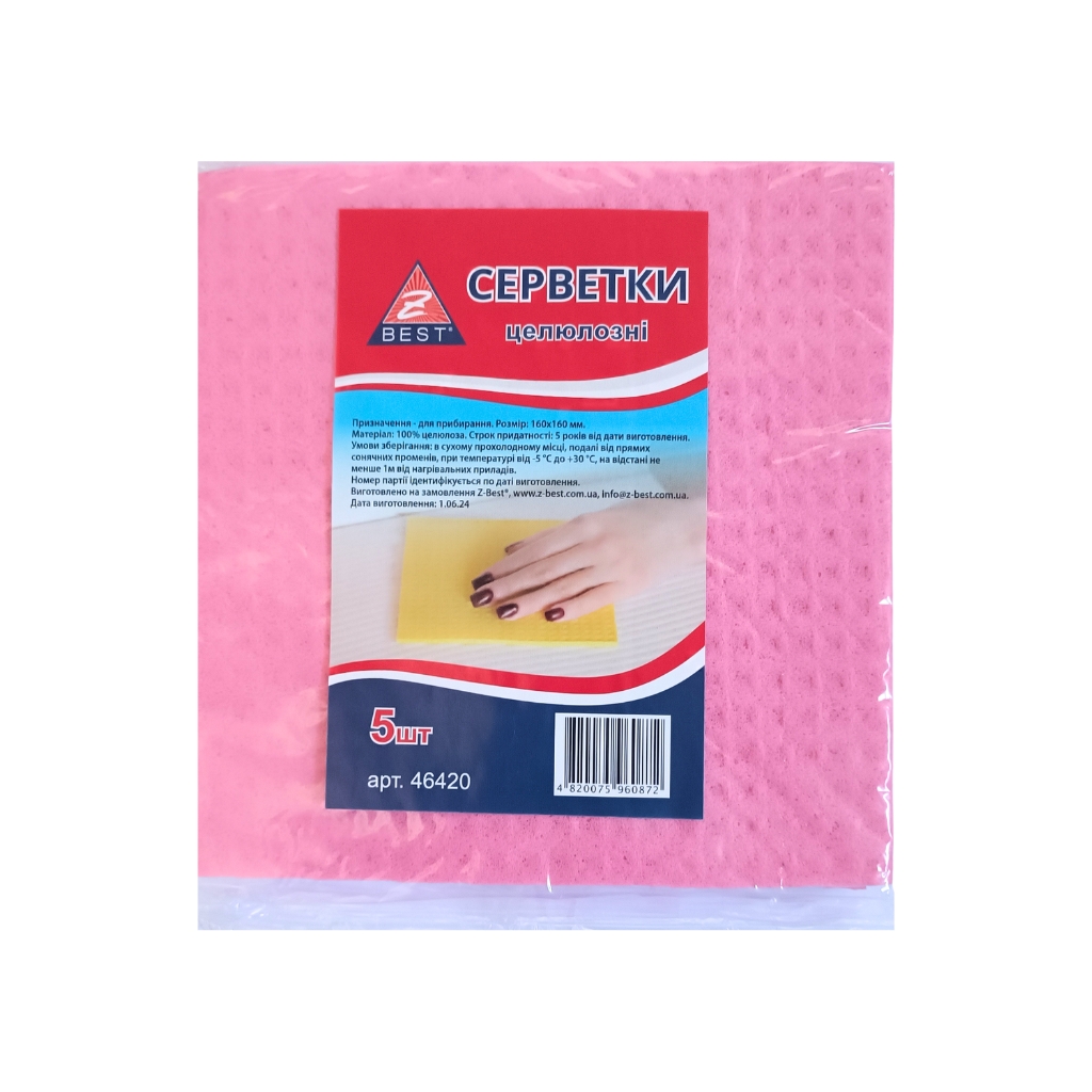 Серветки для прибирання целюлозні ТМ “Z-BEST” призначені для вологого прибирання будь-яких поверхонь. Мають високу здатність до вбирання вологи, не залишають ворсу та розмитого бруду, не пошкоджують поверхню, забезпечують високий рівень гігієнічності.Умови зберігання – тримати в сухих приміщеннях при температурі від +5°C до +40°C поділ від джерел тепла та прямих сонячних променів.Термін придатності: 5 років з дати виготовлення.Матеріал – 100% целюлоза.Країна виробник: Україна.