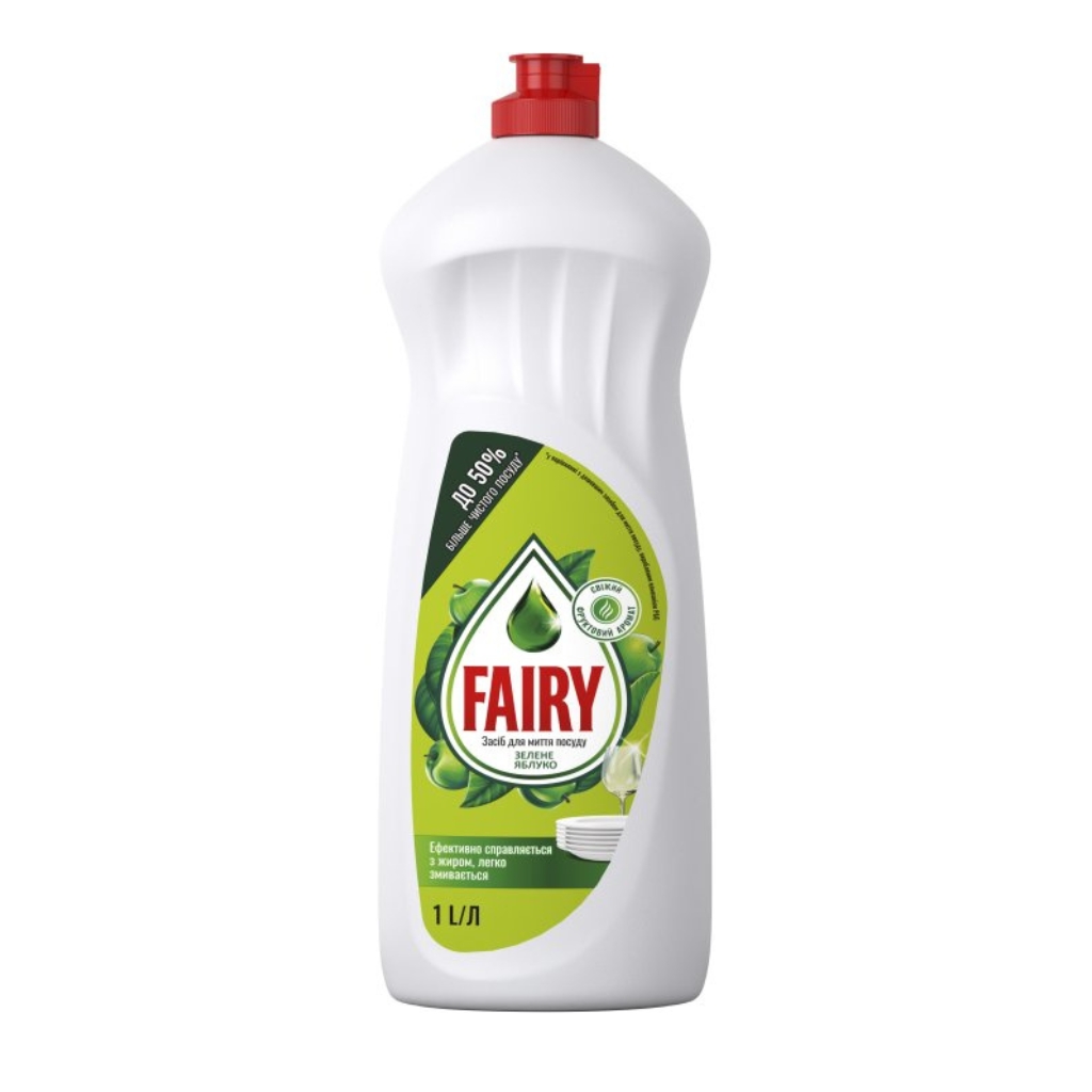 Ефективне і економічне засіб для миття посуду. Fairy з активною формулою видаляє пригорілий жир і забруднення. Володіє чудовою очищає здатністю і піноутворенням. Fairy Зелене яблуко видалить пахнуть залишки їжі з вашої посуду, залишивши посуд свіжою і блискучою чистою. Утворює рясну піну яка дозволяє зменшити витрату засобу до 50% у порівнянні з звичайними засобами для миття посуду. Економічна упаковка.
