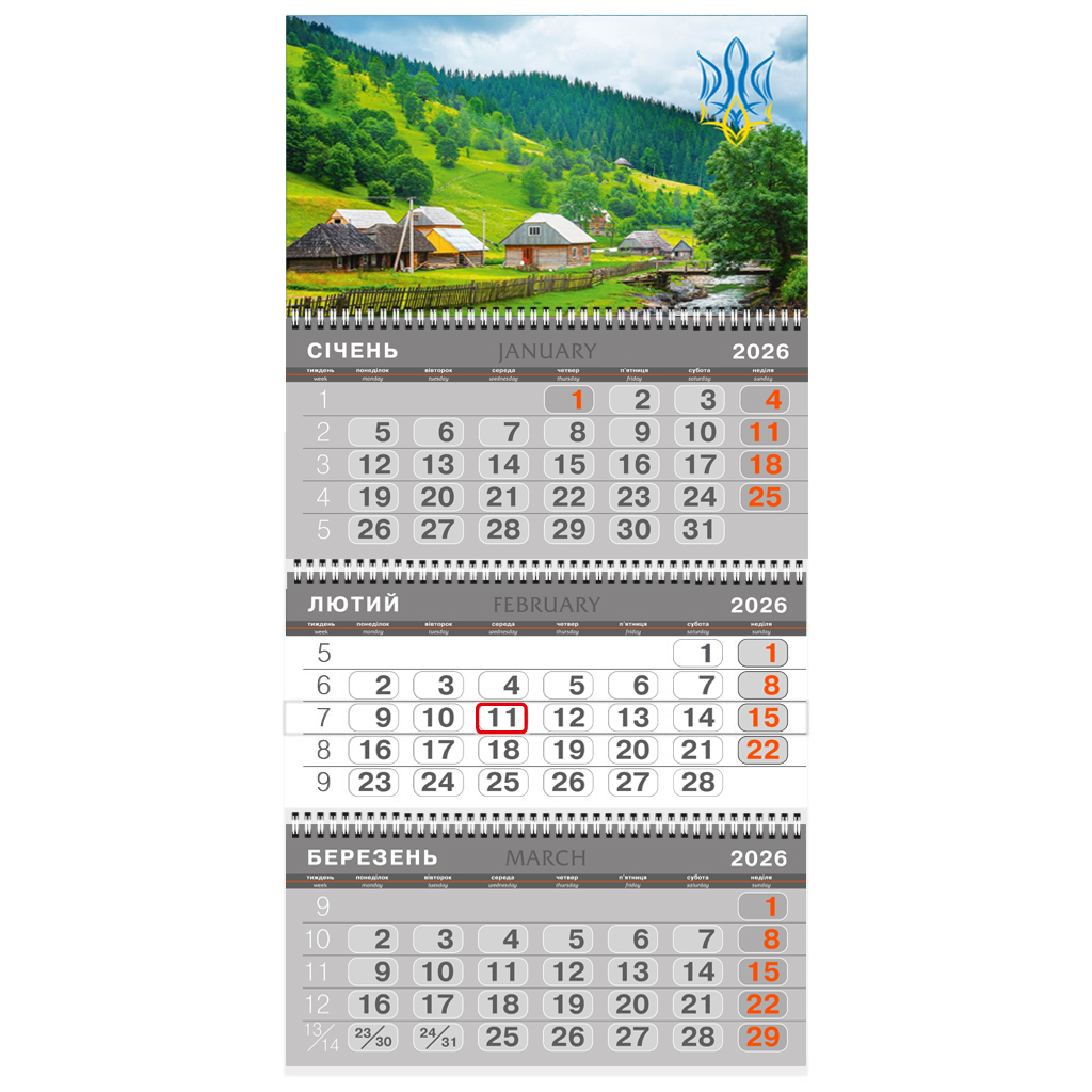 Опис Календар квартальний на 3 пружини, розмір 360х685 мм, "Карпатське село"