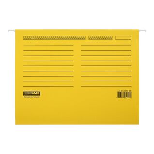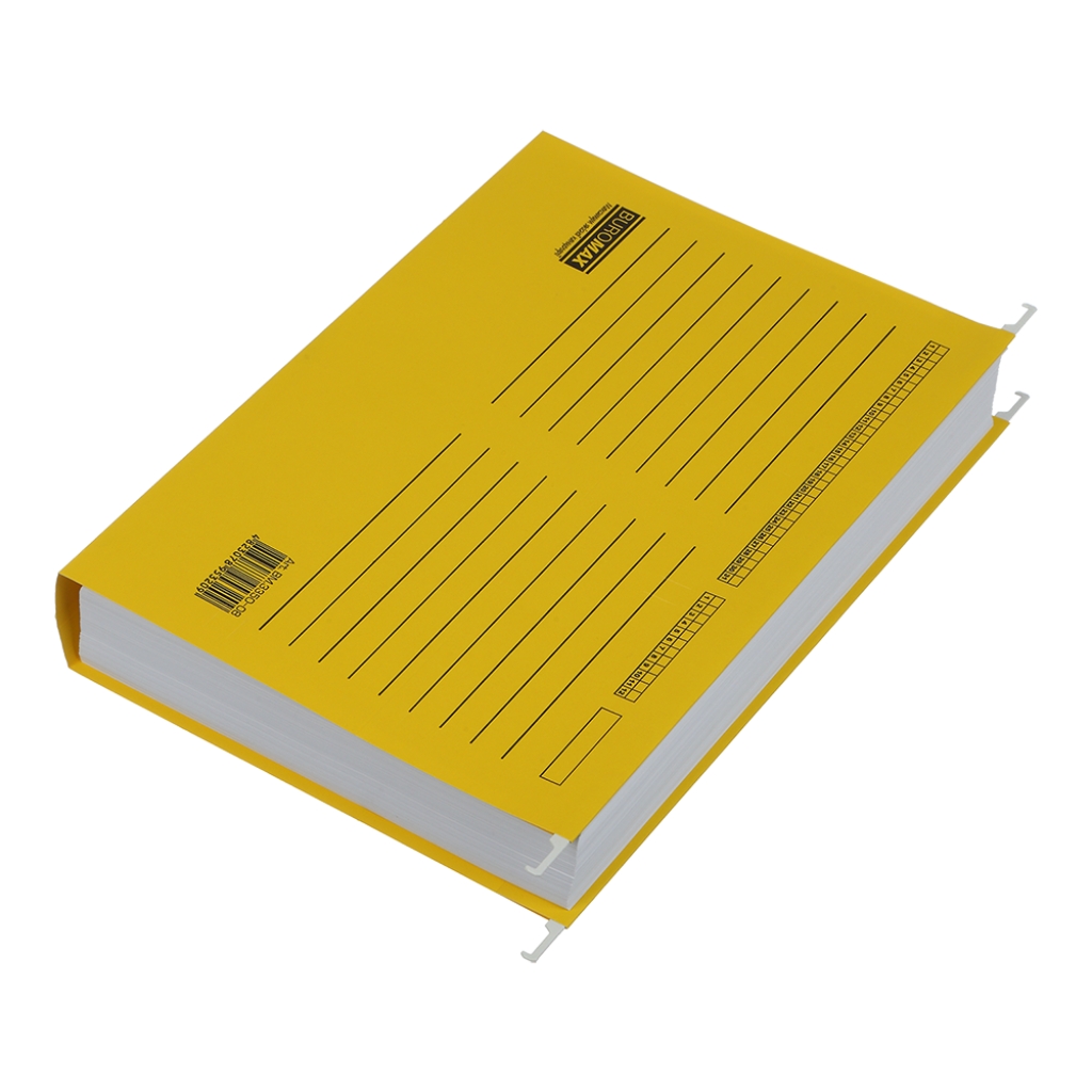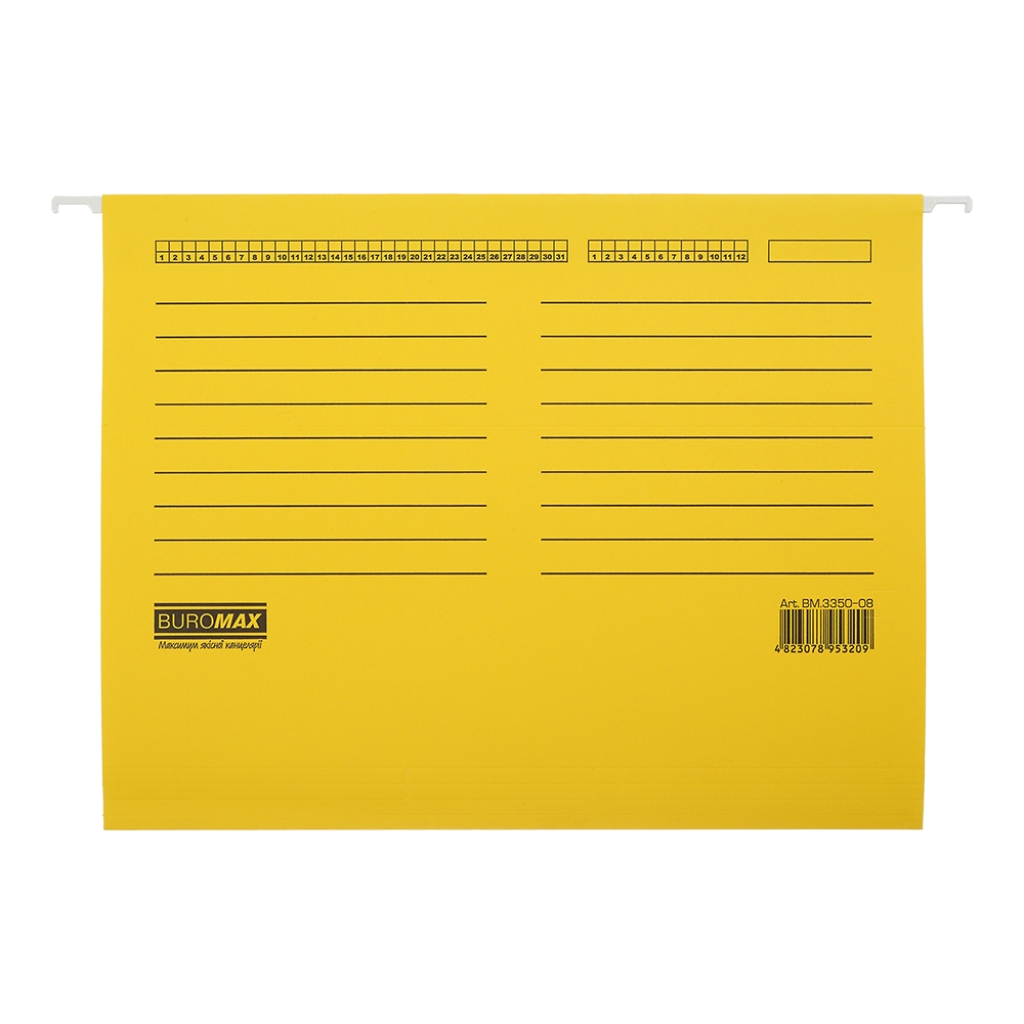 Підвісний картонний файл від Buromax для зберігання та сортування документів.формат : А4+матеріал: картон жовтого кольору, щільністю 230 г/м? пересувний пластиковий тримач для змінних маркувальних паперових індексів-ярличків опорні планкиспеціальні прорізи для установки механізму швидкозшивачабіговка на нижній частині файлу для розширення, а також на лицевій та оборотній стороні, що дозволяє відкривати файл та переглядати документи у підвішеному станіупаковка: по 10 шт у прозорому пакеті з клеєвим клапаном