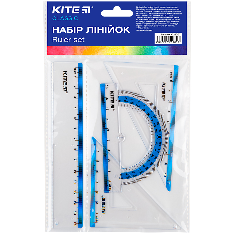 - склад набору: лінійка 15 см, 2 косинця, транспортир,