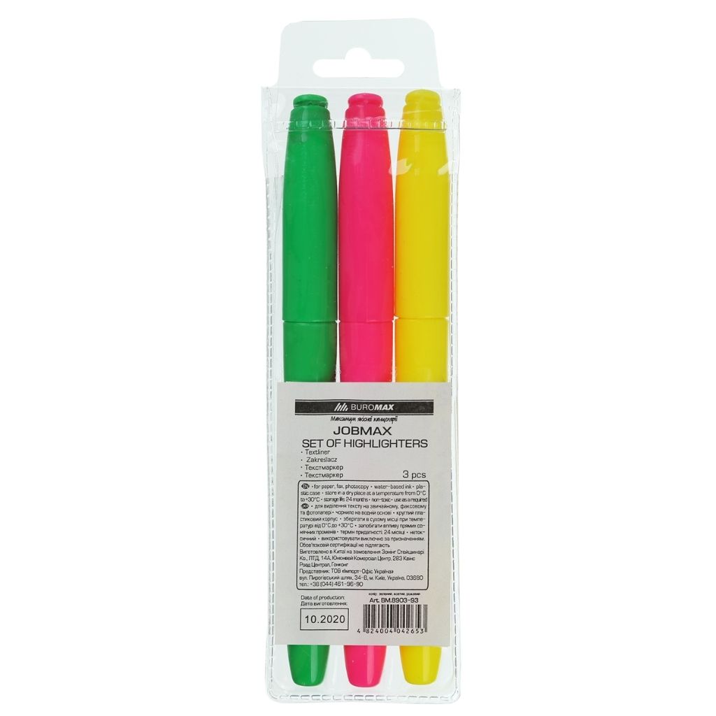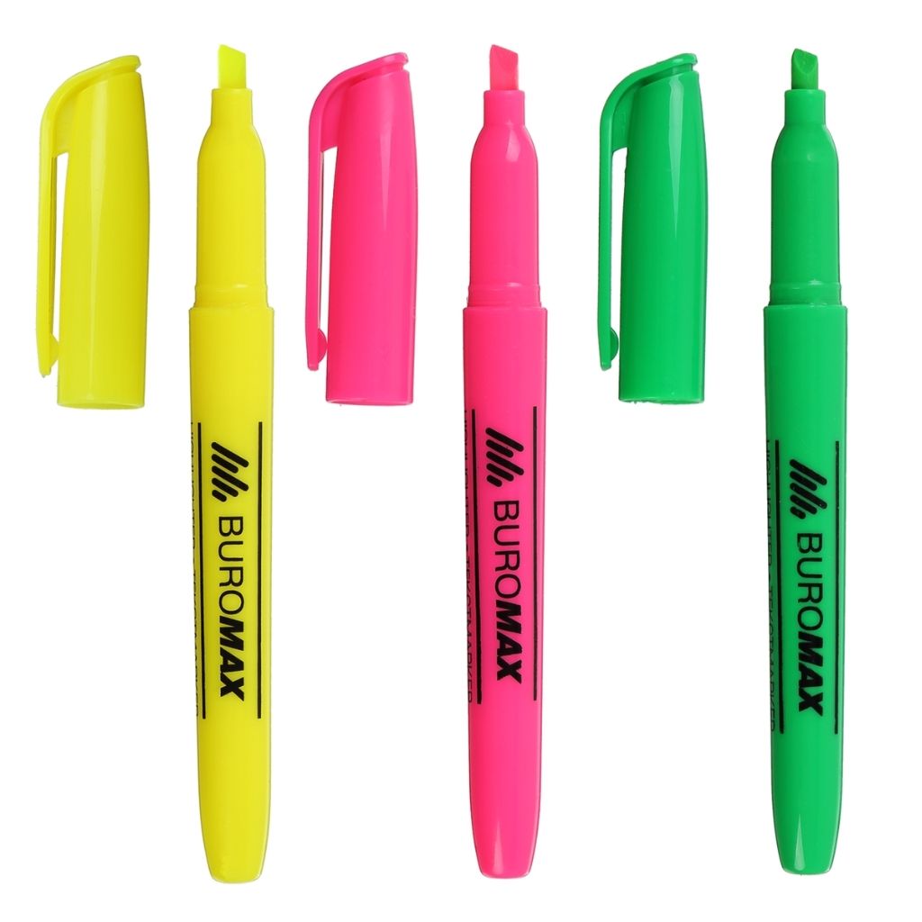 Високоякісні чорнила текстових маркерів BUROMAX спеціально розроблені для зручного та легкого виділення тексту на різних видах паперу. За допомогою текстових маркерів BM. 8903 можна швидко виділити як текст, написаний від руки, на папері різної щільності, так і текст на факсовому папері, а також текст, надрукований за допомогою різних принтерів та копіювальних апаратів. Чорнила маркерів BM.8903 не розмазують виділений текст, залишають лінію, через яку можна чітко побачити текст. Чорнила не просочуються навіть через тонкі сорти паперу. Зносостійкий пишучий вузол з гладким пористим клиноподібним наконечником забезпечує насичені та чітку лінію товщиною від 2 до 4 мм, яка може варіюватися залежно від нахилу маркера при письмі. Написи легко та плавно лягають на папір, що робить процес використання маркера BM. 8903 максимально комфортним. Пишучий вузол та наконечник витримують високі показники натиску без втрати функціональних властивостей. Корпус з первинного PP (поліпропілену) не пропускає повітря до стрижня, забезпечуючи тривале зберігання та використання маркера. Завдяки чорнилам на водній основі, сліди від маркера легко змиваються з тканин, а також різних поверхонь. Відсутність різкого хімічного запаху разом з безпечною водною основою робить процес використання текстових маркерів BUROMAX комфортним та ефективним для навчання, професійних та побутових потреб. До набору BM.8903-93 входять маркери жовтого, салатового та рожевого кольорів.Упаковка: PVC-пенал з європідвісом.