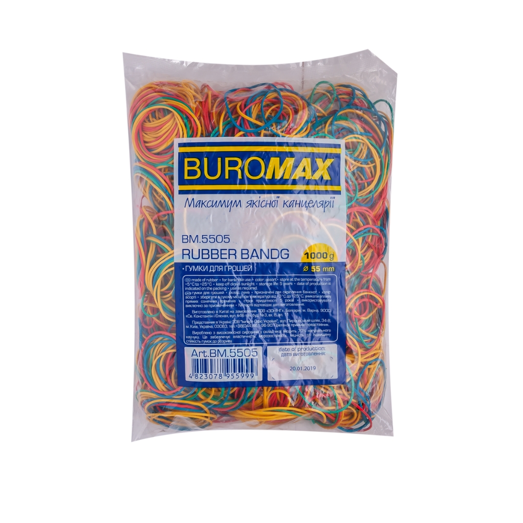 Гумки для грошей від BUROMAX призначені для перетягування грошових купюр. Але окрім цього, дана продукція використовується для з'єднання упаковок медикаментів в аптеках і на виробництві, фасування канцелярських інструментів, дрібної торгівлі, при виготовленні побутових приладів, а також широко використовуються для різних потреб в домашніх умовах тощо.Діаметр гумки 55 ммВ упаковці 1000 г ( приблизно 1440 гумки )МорозостійкіЕластичні, міцні та стійкі до розриву Колір: асортіУпаковка: прозорий пакетГумки для грошей BUROMAX – хіт продажів за найкращими цінами!