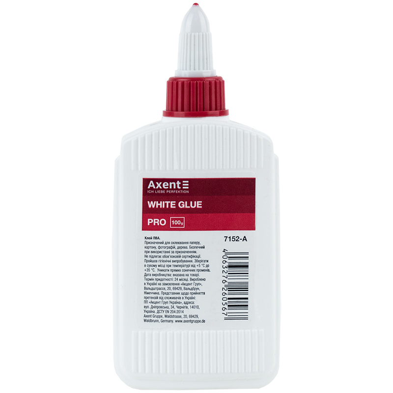 Клей ПВА Axent PRO використовується для склеювання паперу, картону, фотографій, тканини і дерева. Ковпачок-дозатор регулює подачу клею та запобігає його висиханню, дозволяє наносити клей краплями або тонкою лінією. Не токсичний, змивається водою. Об'єм 100 мл.