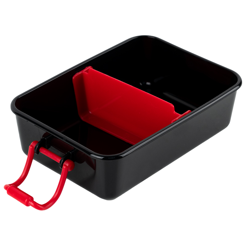 Компактний та місткий, він відмінно поміщається в рюкзаку. Кришка з силіконовою вставкою щільно закривається і фіксується за допомогою надійних бічних засувок. Усередині розділений на 2 частини пересувною перегородкою, яка перешкоджає змішуванню продуктів. Можна взяти з собою в одному контейнері одразу 2 страви.
