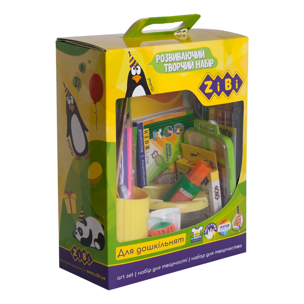Подарунковий набір для дошкільнят від ZiBi являє собою комплект необхідного, зручного приладдя та матеріалів для розвитку малюка. Набір підходить як для дівчинки, так і для хлопчика.До складу набору входять 17 предметів:Воскові тригранні олівці JUMBO, 6 кольорівФломастери, тригранні, з потовщенним корпусом JUMBO, 6 кольорівКольорові олівці, 12 кольорівНабір з 2-х чорнографітових олівців, з потовщеним корпусом JUMBOАкварельні фарби, 10 кольорівЧинка для олівців, овальнаЧинка для олівців з контейнеромПензлик з щетиниПензлик з натурального ворсу поніАльбом для малювання, формату А5Кольоровий папір, 8 кольорів, Формат А5Кольоровий картон, 8 кольорів, формат А5Клей ПВАПластилін, 7 кольорівНожиці дитячіСтакан - непроливайкаСтакан для письмового приладдяУпаковка: яскрава подарункова картонна коробка з ручкою для зручного транспортування та прозорим віконцем для візуалізіції вмісту.