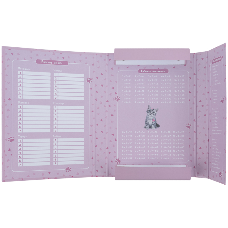 Щоб важливі речі завжди були перед очима, всередині є поле для розкладу, табличка множення та список величин.