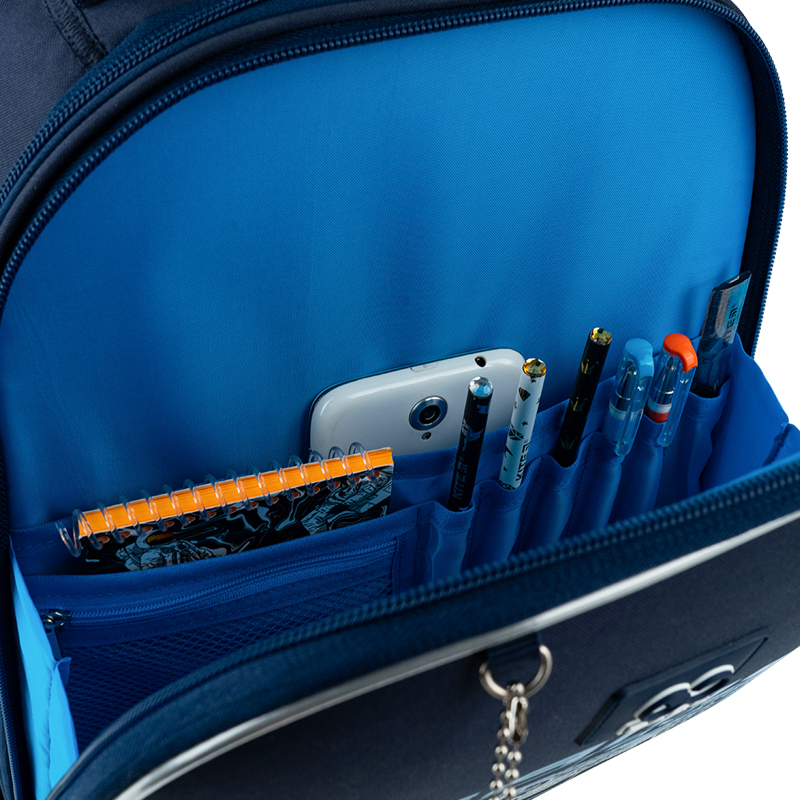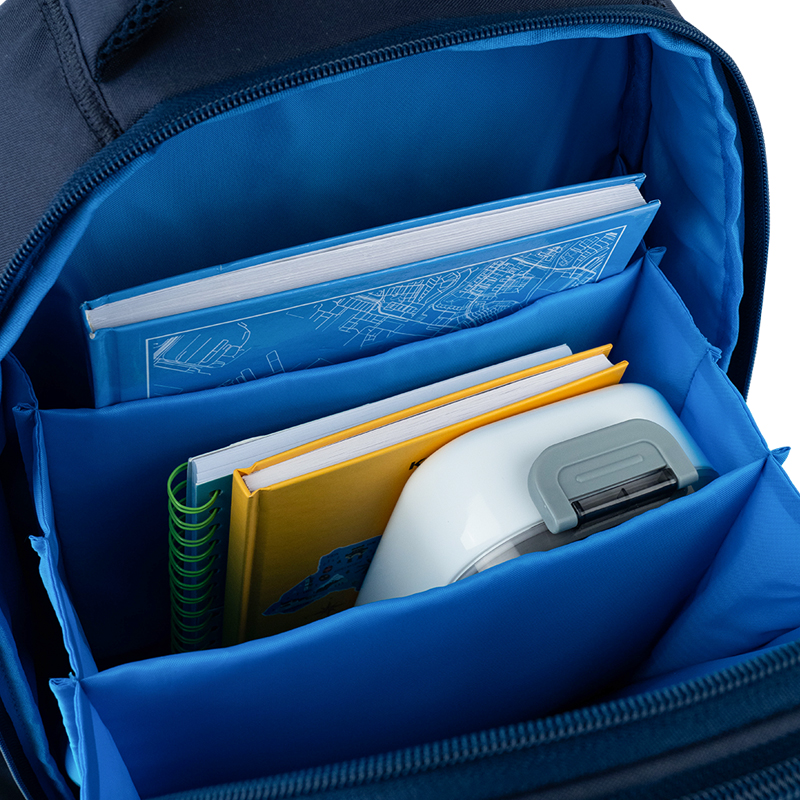 - Внутрішні роздільники, органайзер для канцелярії та кишеньки допомагають акуратно складати речі.