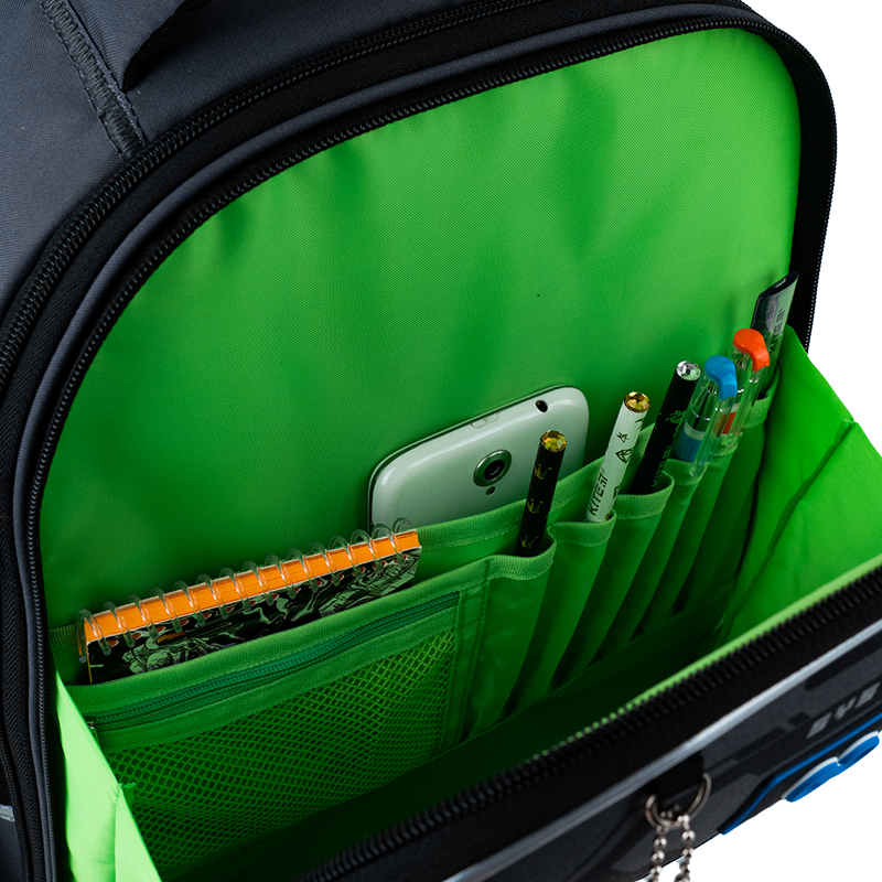 - Внутрішні роздільники, органайзер для канцелярії та кишеньки допомагають акуратно складати речі.