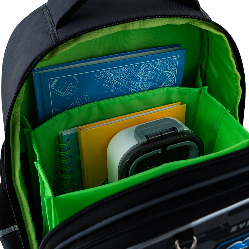Напівкаркасна конструкція забезпечує легкість рюкзака, а також допомагає тримати форму, що робить його дуже зручним для щоденного використання. В рюкзаку легко зберігати порядок — канцтовари та книги не мнуться і завжди залишаються на своїх місцях. Жорстка передня панель надійно тримає форму та захищає вміст рюкзака, а м’які боковинки роблять рюкзак полегшеним. З ним дитині буде легко підтримувати канцелярію в охайному вигляді, а батькам — бути спокійними за комфорт і здоров’я малечі.