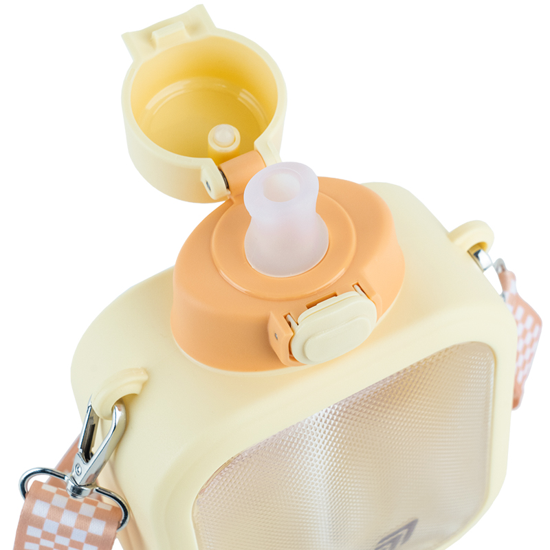 Пляшечка виготовлена з високоякісного тритану – безпечного та міцного матеріалу, що не містить бісфенолу-А, не вбирає запахи та не змінює смак напою. Зручна кришка відкривається легким натисканням кнопки. Усередині – силіконова трубочка, яка дозволяє пити воду, не нахиляючи пляшку. А знімна стрічка для перенесення додає зручності: носіть пляшечку з собою на прогулянки, до школи чи до тренажерної зали!