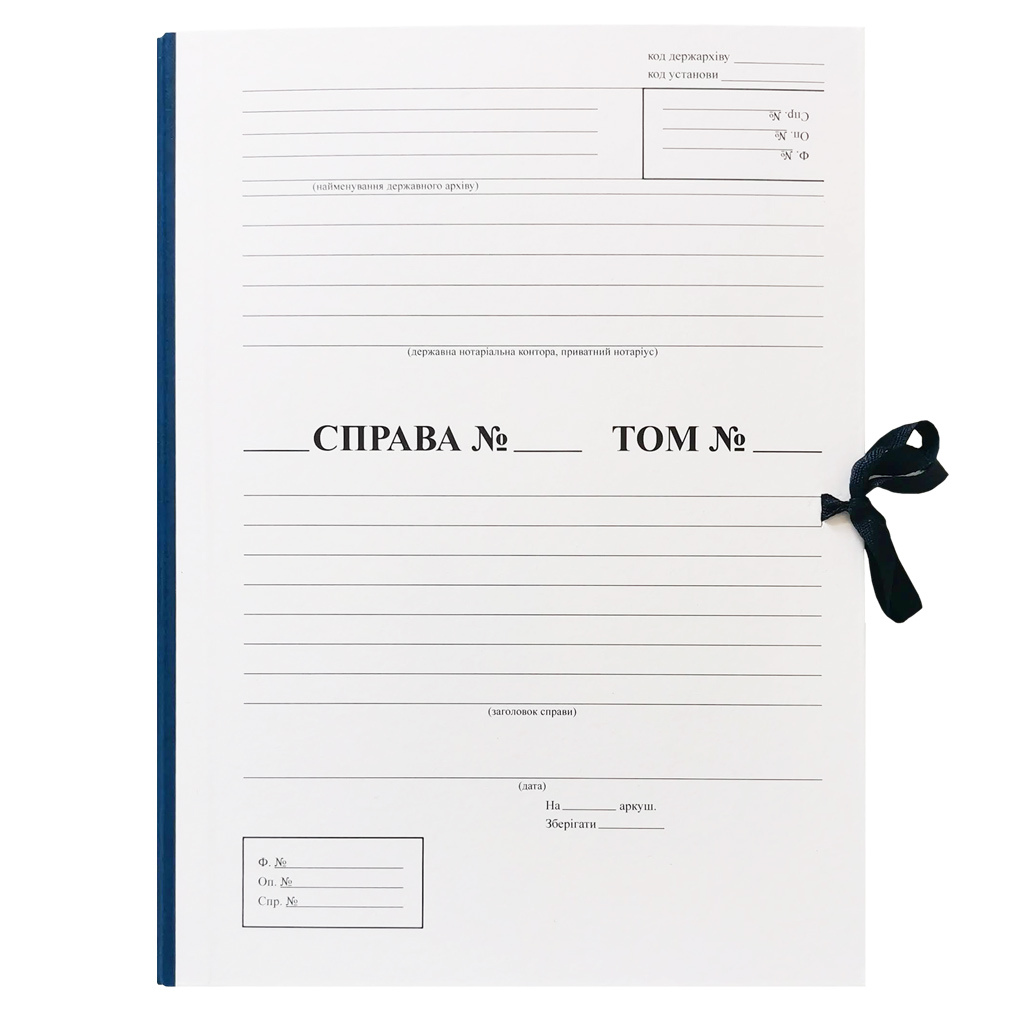 Папка-бокс архівна нотаріуса з титулкою з клапаном, з палітурного картону, обклеєного синім баладеком. На обкладинці папки титульний аркуш згідно з додатком 39 до Правил. Розмір папки 23х32см, товщина корінця 1см.