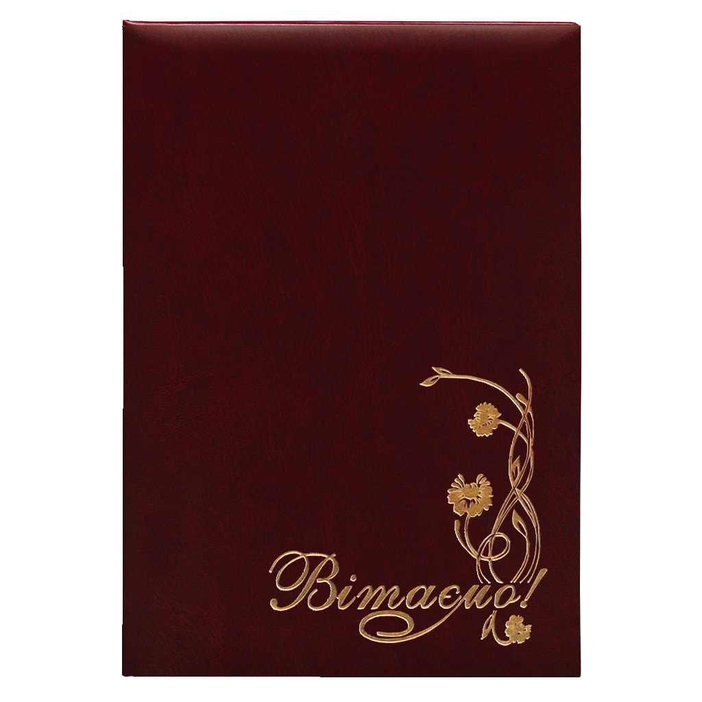 Папка адресна, формат 220х320 мм, обкладинка тверда з поролоном, покривний матеріал баладек, виклейка та вкладиш білий офсетний папір, тиснення фольгою "Вітаємо" Продукція може відрізнятися відтінком в залежності від партії виготовлення.