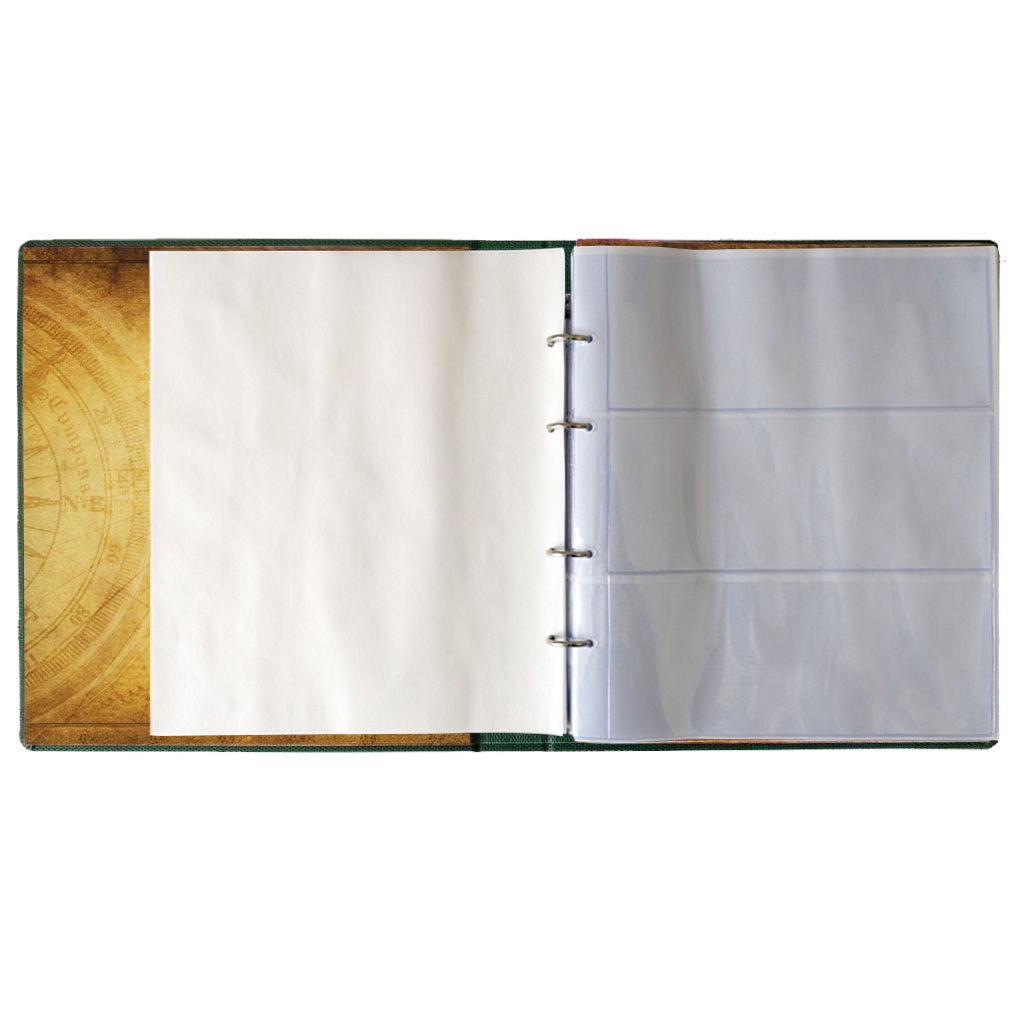 Альбом для банкнот. Обкладинка: покривка штучна шкіра, сторонки картон палітурний з поролоном. Блок складається з 20х куліс на 2 секції 200х75мм. Між кулісами перекладки з пергаменту. Скріплення - кільцевий механізм. Є можливість додавати куліси.